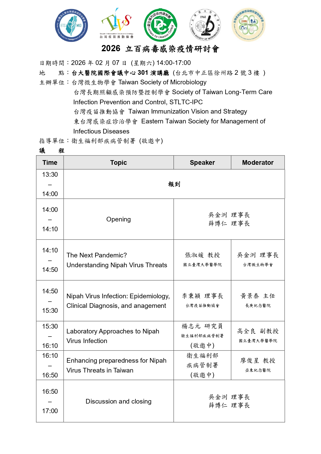 本次會議邀請到多位防疫與臨床領域專家,針對立百病毒的全球威脅、臨床診斷及台灣的防疫整備工作進行深度探討 。誠摯邀請各位會員踴躍報名參加。